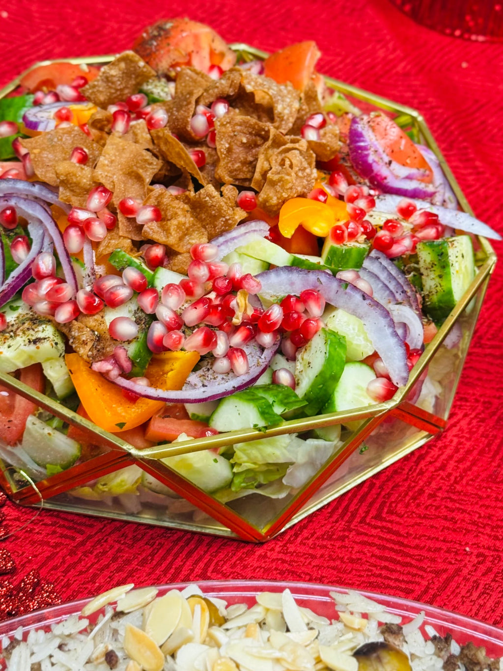 Fattoush is a vibrant Middle Eastern salad that combines crisp lettuce, tomatoes, cucumbers, and radishes with a tangy sumac vinaigrette. Topped with crispy pita chips for a satisfying crunch, this traditional Middle-Eastern dish delivers fresh flavors and wholesome ingredients in every bite. Perfect as a light meal or refreshing side, Fattoush brings authentic Mediterranean taste to your table.